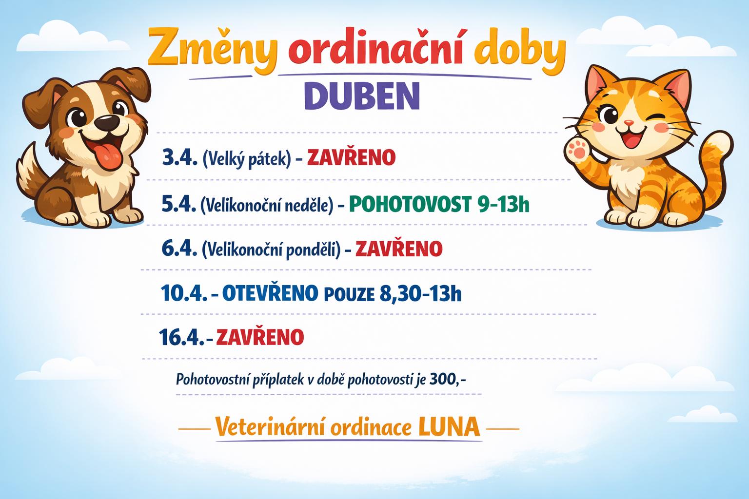 - ! Změna ordinační doby v DUBNU! Velký pátek 3.4. ZAVŘENO. Velikonoční neděle 5.4. POHOTOVOST 9-13h. Velikonoční pondělí 6.4. ZAVŘENO. Pohotovostní příplatek je 300,-.